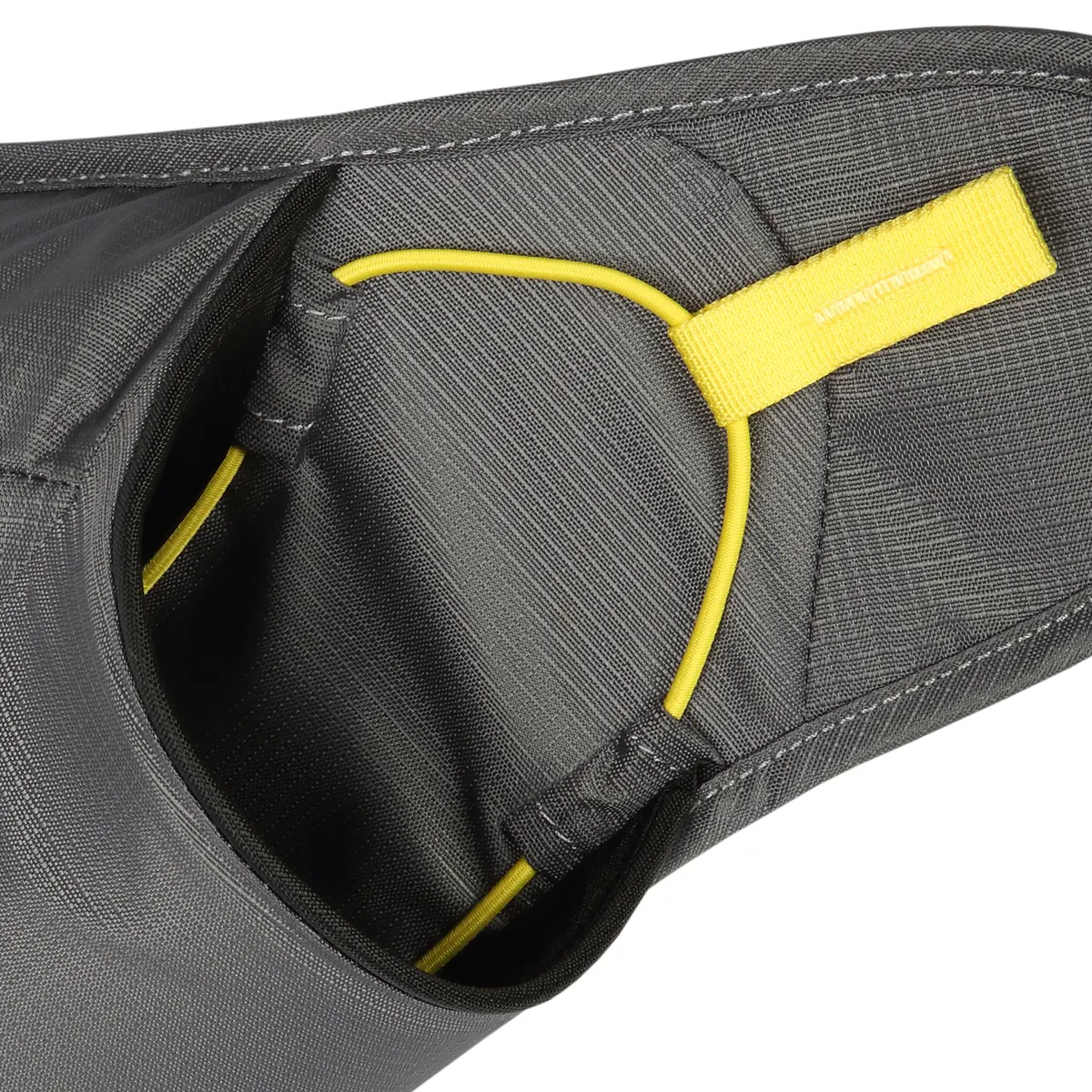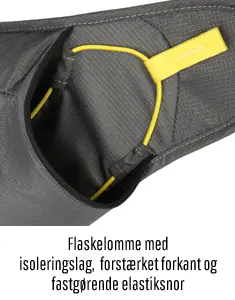 Flaskelommen er placeret diagonalt i en 50° vinkel, hvilket gør det nemt at tage flasken ud og sætte den tilbage igen under bevægelse. Denne vinkel sikrer ikke kun en dynamisk og let adgang, men holder også flasken sikkert på plads under sportsaktiviteter. For ekstra sikkerhed kan flasken fastgøres med en elastiksnor med en hurtiglukker over halsen. Lommen er forstærket med 3 mm EVA-skum, som fungerer som en termisk isoleringslag og hjælper med at holde lommen i en optimal 3D-form for nem håndtering af flasken. Lommens forkant er desuden forstærket med en solid kant.
