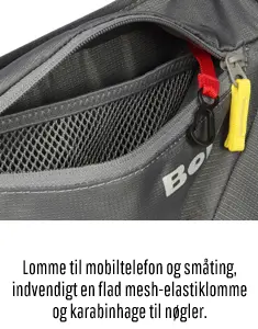 På fronten af bæltetasken er der en rummelig lomme, som er perfekt til opbevaring af en mobiltelefon i standardstørrelse samt andre små nødvendigheder. Indvendigt er der en mesh-lomme på bagpanelet, samt en karabinhage til sikker fastgørelse af nøgler.
