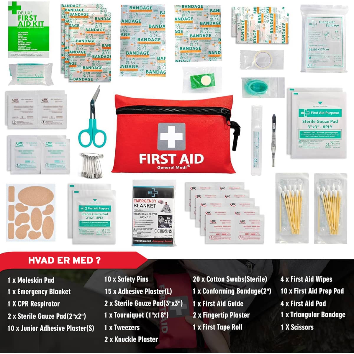 Du vil finde en bred vifte af forsyninger, herunder bl.a. forskellige typer bandager, saks, plaster, nødtæppe og vabelplaster. Disse elementer er uundværlige til behandling af mindre skader, som snitsår, vabler, forbrændinger og andre almindelige skader, der kan opstå i dagligdagen eller under rejser.