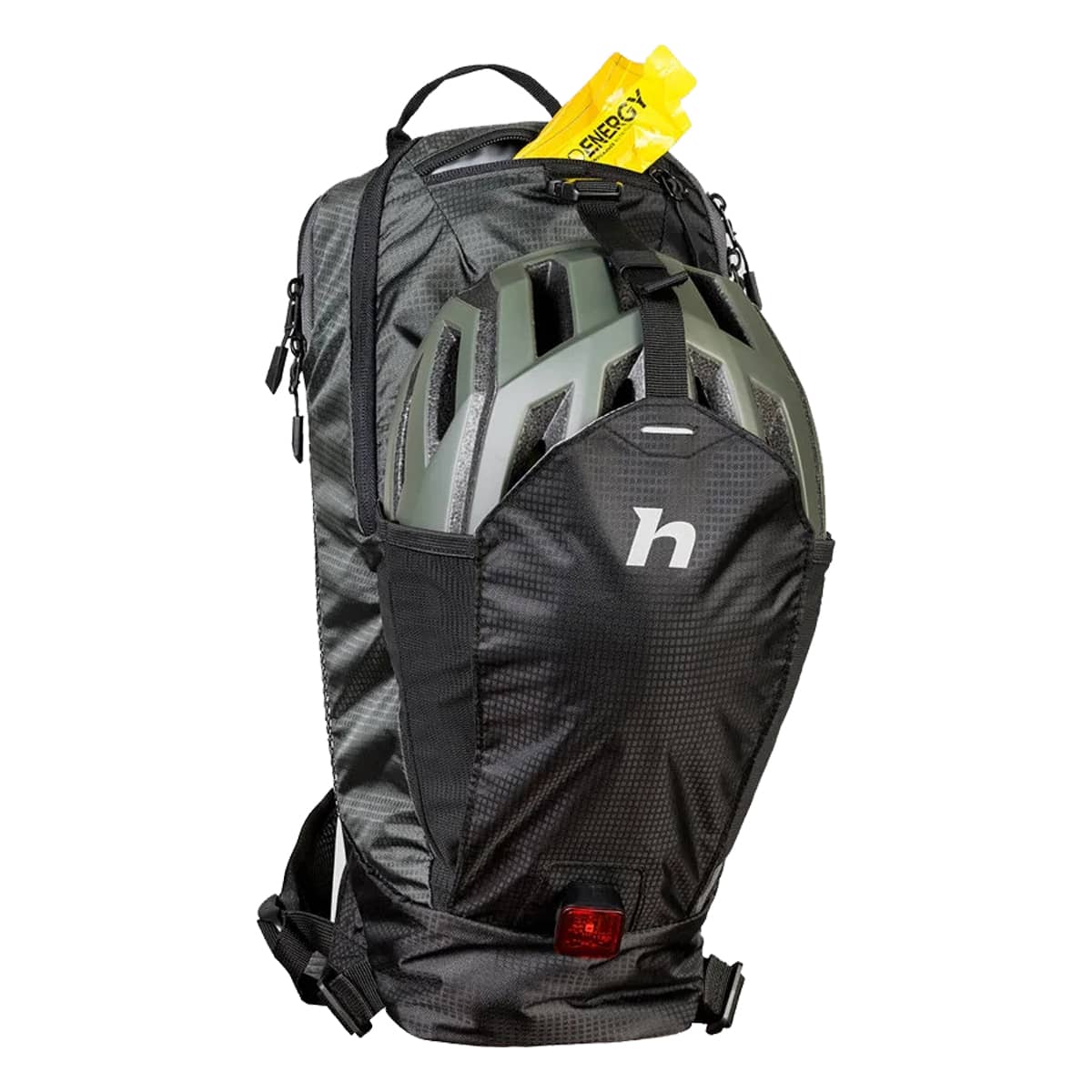Et et praktisk håndtag i toppen, en dedikeret lomme til en lygte og en frontlomme til opbevaring af din hjelm øger funktionaliteten.